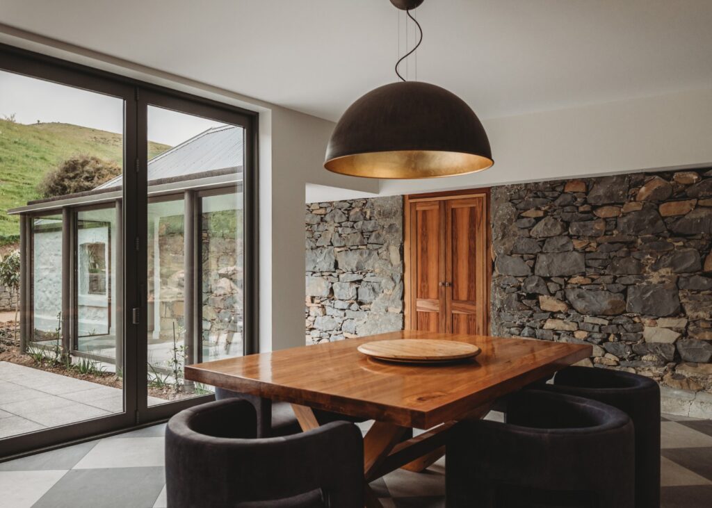 The design of the main living space incorporates a beautiful timber ceiling and exposed rafters that echo the timber sarking exposed under the cottage roof. The selected timber was Southland Maple Beech. A freestanding double-sided woodburner site between the living and dining room. Here, 2.8m-high bi-fold doors provide a spectacular view up to the ridge of the adjacent hills, and ample morning sun.
