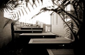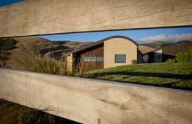 Council requirements meant that the house could not dominate the hill side and height restrictions meant only a single storey solution was possible. The chosen location for the house was just beneath a ridge line facing north-west with an expansive view out over the Canterbury Plains to the Southern Alps. The design allowed the home to recede into the hill side, a row of concrete block buttress walls affording a regular deep shadowing across the main facade. These buttresses also serve to anchor the home to the foundations and resist wind loads and uplift. A gently curved asymmetrical roof mimics the ground slope and gently deflects the strong winds over the building. Wind noise within the home is reduced and the internal curved ceiling adds a sense of height and space appropriate to the setting.