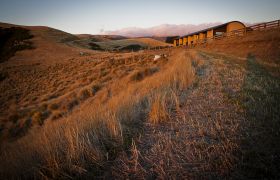 Robust materials were chosen to cope with the environmental conditions and blend with the tussock landscape. These comprised buff-coloured concrete blocks, a natural soil colour of the region, contrasted with dark stained timber weatherboards to reinforce the depth and shadow of the facade.